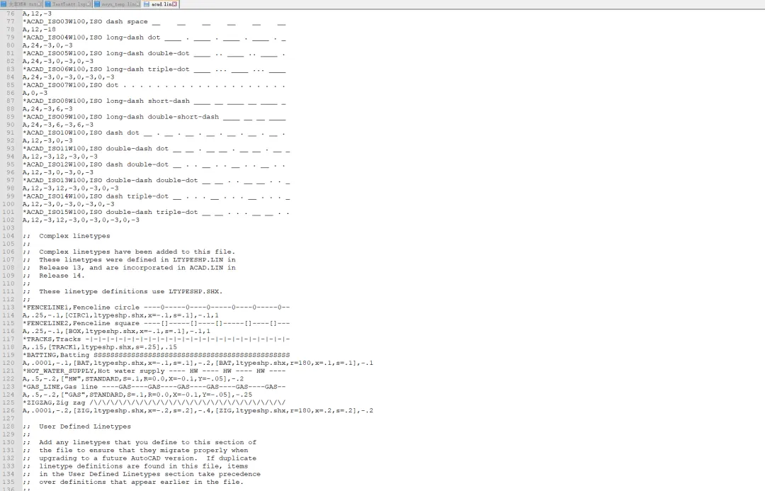 打开CAD的 .lin 文件,你会发现线型主要分为两大类。理解这些参数,是开发的基础。