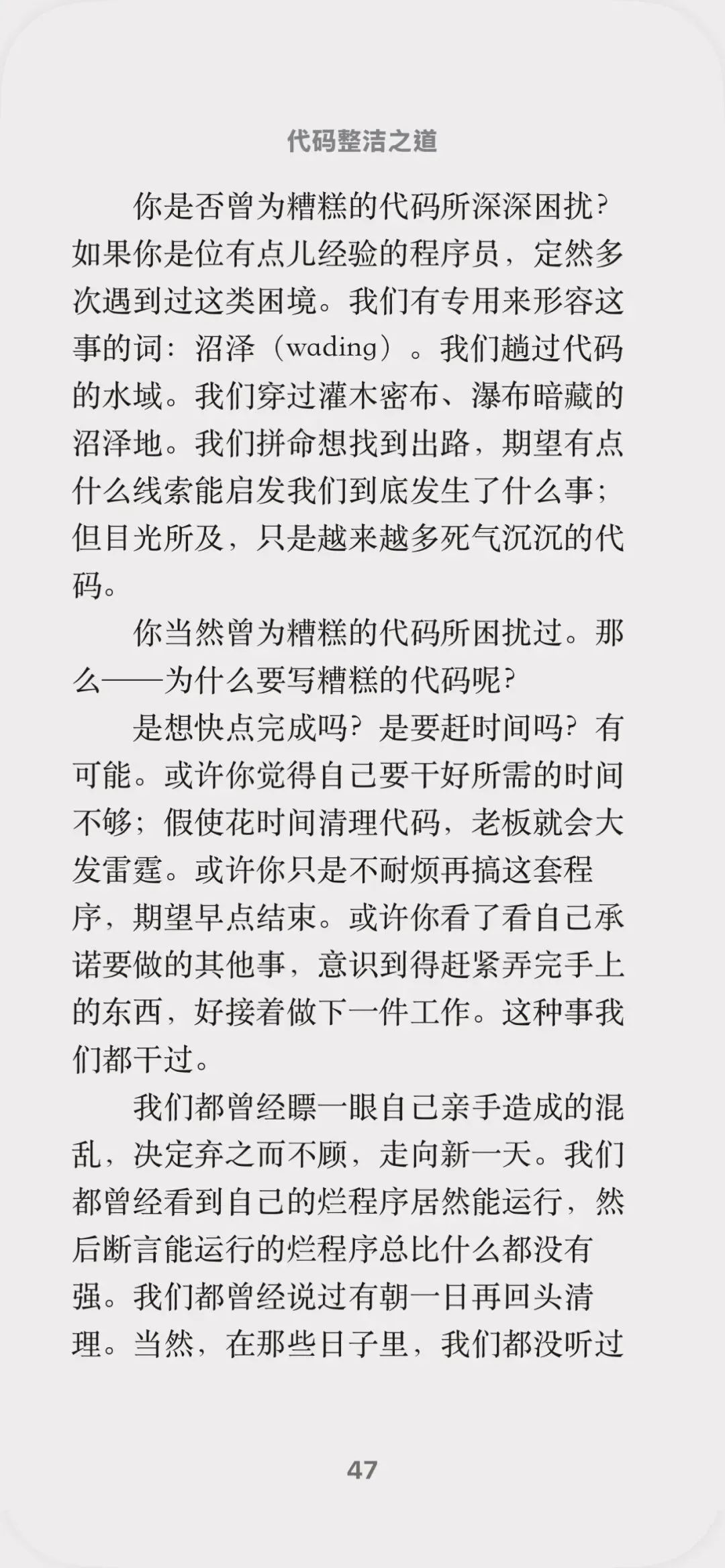 · 阅读重点:关注“类”、“函数”、“注释”、“格式”这几章。它会直接改善你“结构不清”和“逻辑组织”的问题。