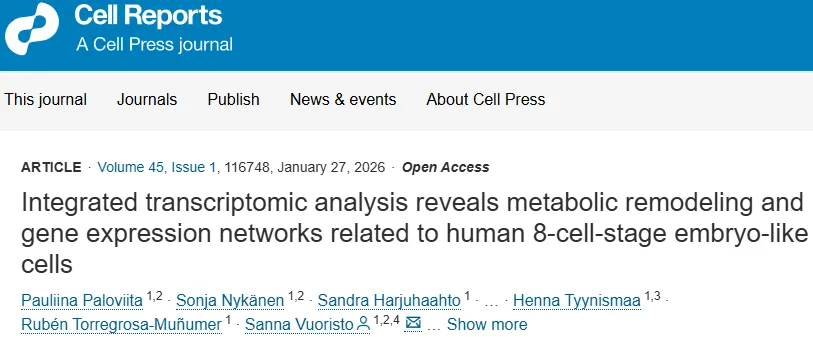 2026年1月,赫尔辛基大学的Sanna Vuoristo团队在《Cell Reports》杂志发表研究,通过整合转录组分析揭示了与人类8细胞期样细胞(8CLCs)相关的代谢重塑和基因表达网络。今天我们就来拆解一下这篇文章:Integrated transcriptomic analysis reveals metabolic remodeling and gene expression networks related to human 8-cell-stage embryo-like cells。