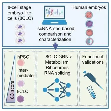 人类早期发育研究面临样本稀缺和细胞数量少的挑战。8细胞期样细胞(8CLCs)的出现为理解人类胚胎基因组激活提供了机会,但不同诱导系统产生的细胞在多大程度上反映了真实胚胎发育尚不明确。本研究整合了多个诱导系统的单细胞转录组数据,通过比对真实胚胎参考系,识别了8CLCs中的关键基因模块、转座子表达及生物学过程。研究确定了成熟态与中间态8CLCs的区别,并揭示了代谢重塑、RNA剪接和核糖体生物合成在其中的作用。