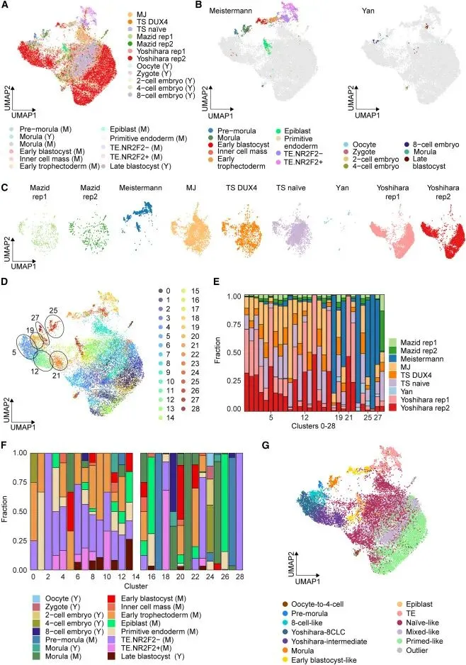 图4:多数据集整合分析显示,Yoshihara和Mazid的数据集在转录谱上最接近真实的人类8细胞期胚胎。