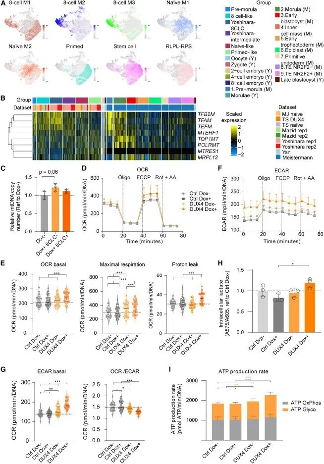 研究团队收集了包括自发产生、DUX4诱导及化学诱导在内的多种8CLC诱导系统的单细胞转录组原始数据。这些数据被统一比对至GRCh38人类参考基因组,并与已发表的人类卵子及胚胎数据进行整合分析。实验通过生物信息学手段对细胞进行聚类、细胞周期评分、基因共表达网络(GRN)分析以及转座子(TE)表达量化。此外,研究人员还利用流式细胞术验证了细胞周期分布,并使用Seahorse XF分析仪检测了DUX4诱导后的线粒体呼吸和糖酵解活性。