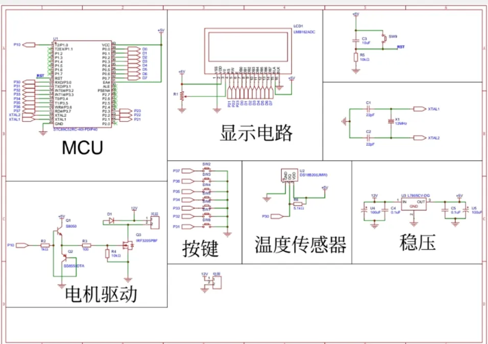 本设计以STC89C52单片机为核心控制器,构建了一套完整的智能温控风扇系统。系统硬件部分主要包括:采用DS18B20数字温度传感器实现高精度(±0.5℃)温度采集,其单总线协议简化了电路连接;利用LCD1602液晶显示屏实时显示当前温度、预设阈值及风扇工作状态,提供了清晰的人机交互界面;通过单片机生成PWM信号,驱动由三极管和直流电机构成的调速电路,实现对风扇转速的动态控制。软件设计上,系统实现了基于温度阈值的分级调速逻辑:当环境温度低于下限阈值时,风扇停止;温度在多个阈值区间内时,风扇以对应档位的PWM占空比运行,转速随温度升高而阶梯式增加。