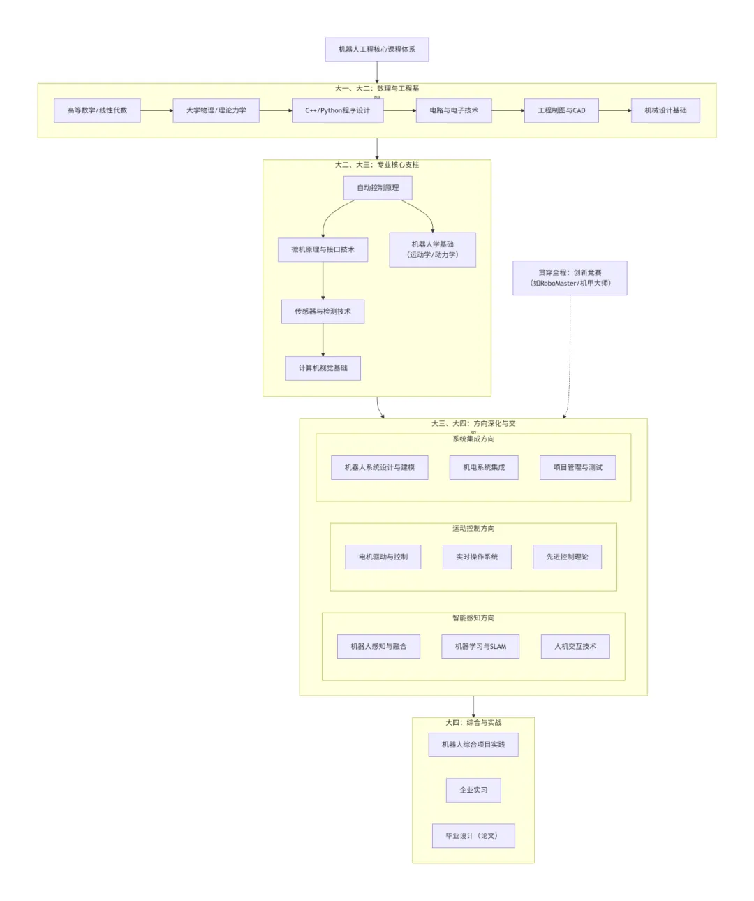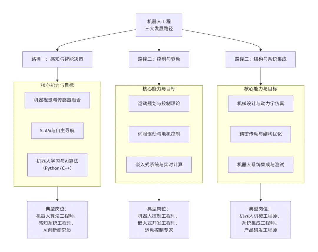 机器人工程知识体系庞大,本科阶段通常会在高年级形成方向侧重,主要发展路径如下图所示