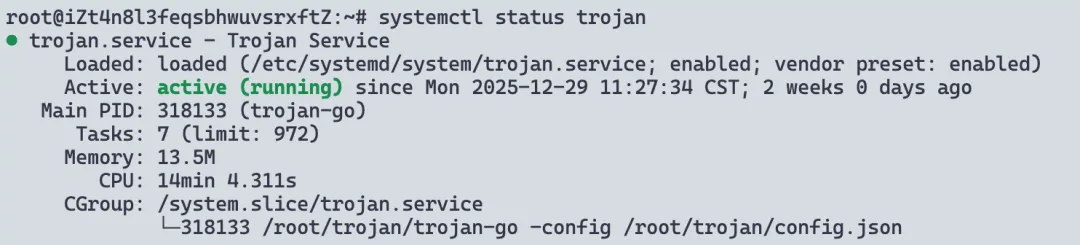 保存为:/etc/systemd/system/trojan.servicesystemctl daemon-reloadsystemctl start trojan