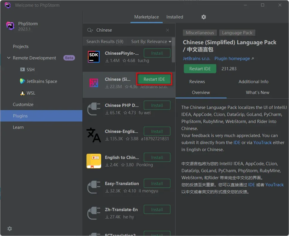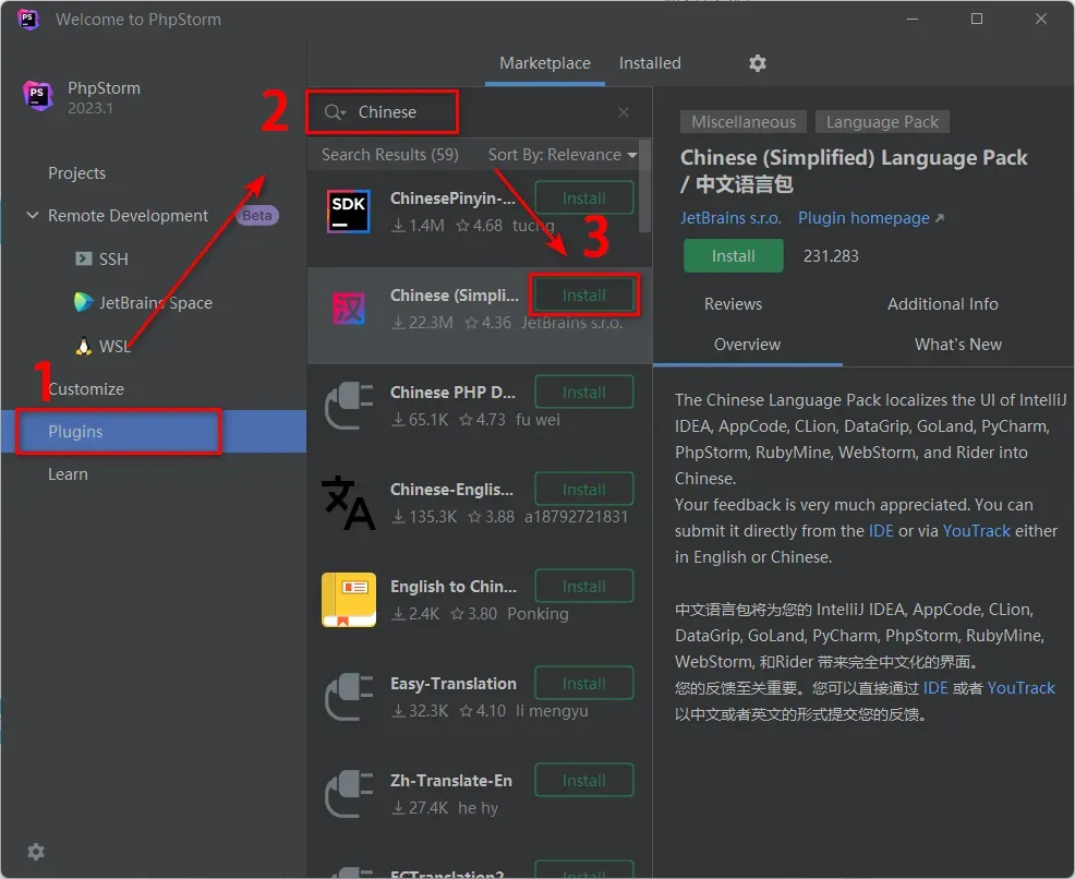 22.点击Plugins,输入:Chinese,找到Chinese(Simplified),点击“Install”