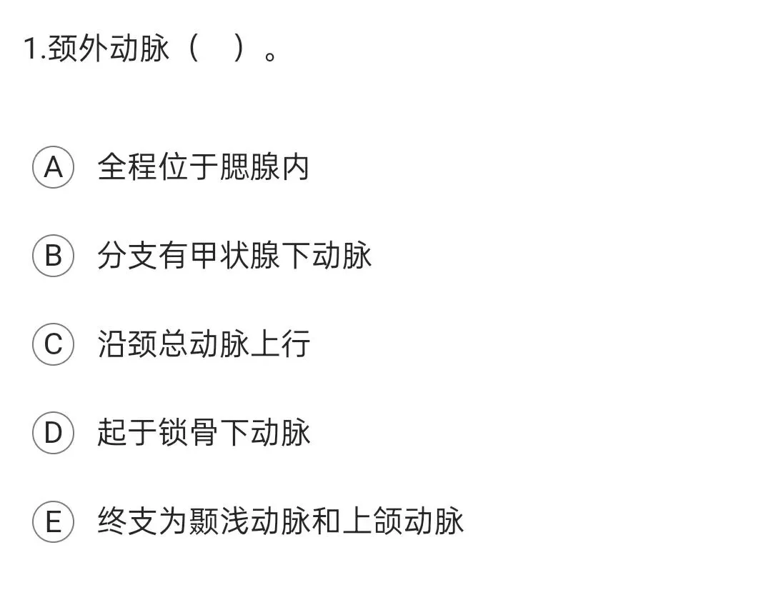 颈总动脉起始后沿气管和食管的外侧上升,至甲状软骨上缘平面分为颈内动脉和颈外动脉两支。颈外动脉上行至下颌处分为颞浅动脉和上颌动脉两个终支。颈外动脉位于颈内动脉前内侧,经其前方转至外侧上行,穿腮腺,在下颌颈处分为颞浅动脉与上颌动脉.其分支:甲状腺上动脉,舌动脉,面动脉,颞浅动脉,上颌动脉,咽升动脉.