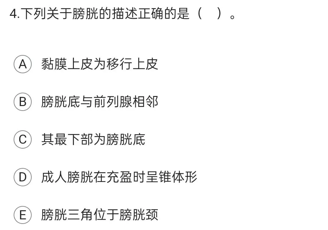 A项,膀胱壁自外向内,由外膜、肌层、黏膜下层和黏膜层所组成,黏膜上皮为移行上皮。BCE三项,膀胱底朝向后下方,呈三角形,包括左、右输尿管末端和膀胱出口之间的三角区,膀胱底的两个外上角处有左、右输尿管穿入膀胱;膀胱的最下部缩细,与前列腺邻接,为膀胱颈,颈的下端即尿道的开口,称尿道内口。D项,成人膀胱在空虚时呈锥体形,分尖、体、底和颈四部。