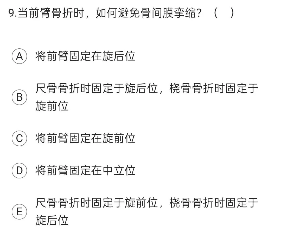 当前臂两骨处于旋前旋后位时,骨间膜松弛,而中立位时骨间膜紧张。故前臂骨折时为避免骨间膜挛缩,应将前臂固定在中立位。