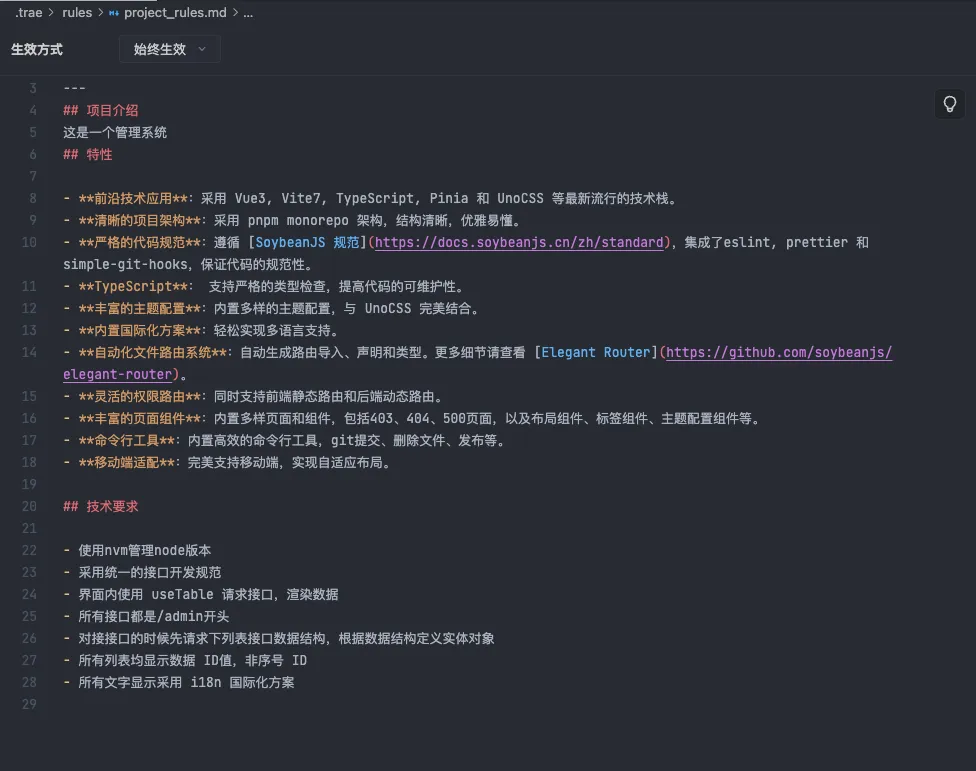 以后端项目为例,我会拆分为「数据库设计要求」「项目开发规范」等独立模块,且不同模块采用差异化生效策略:比如项目开发规范设置为「始终生效」,确保全程代码风格、开发标准统一;数据库设计规则设置为「智能生效」,仅在涉及数据层开发时触发,提升AI响应效率。