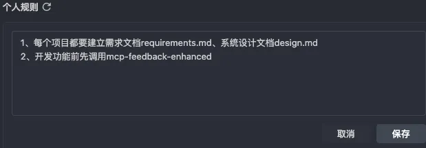 个人规则的配置逻辑相对简单,核心作用是固化通用开发规范,减少重复沟通成本。我主要在其中明确两类内容:
