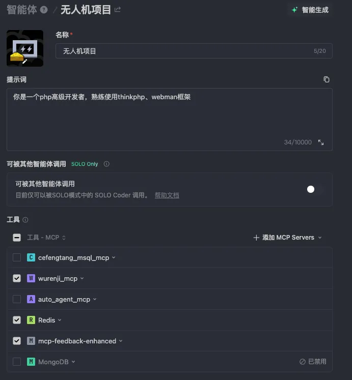 具体配置思路是:在对应智能体的提示词中明确其专属职责(如「数据库模型设计专属智能体」「接口开发智能体」),并关联对应的MCP工具(如数据库MCP、接口测试MCP)。这样能让智能体更精准地理解细分任务场景,输出更贴合需求的结果。
