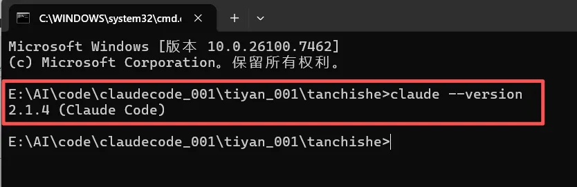 cmd 打开终端后,执行如下命令安装 Claude Code:npm install -g @anthropic-ai/claude-codeclaude --version 检查是否安装成功