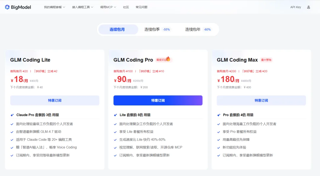 如果使用较多,我们可以选择订阅一个套餐,这样可以放心地使用GLM-4.7,首月订阅有优惠,很划算。