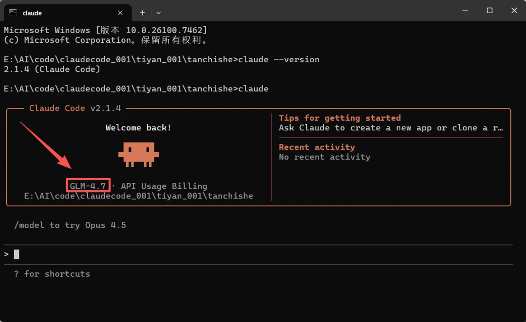 {"env": {"ANTHROPIC_BASE_URL": "https://open.bigmodel.cn/api/anthropic","ANTHROPIC_AUTH_TOKEN": "your_zhipu_api_key","ANTHROPIC_DEFAULT_OPUS_MODEL": "GLM-4.7" },"alwaysThinkingEnabled": false,"model": "opus"}按 win + R ,输入 cmd 打开终端后,执行 claude 命令,显示如下: