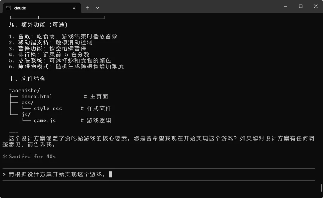 claude 命令后,输入我们的需求我想做一个贪吃蛇游戏,使用html实现,请帮我设计一下,先输出详细的设计方案。