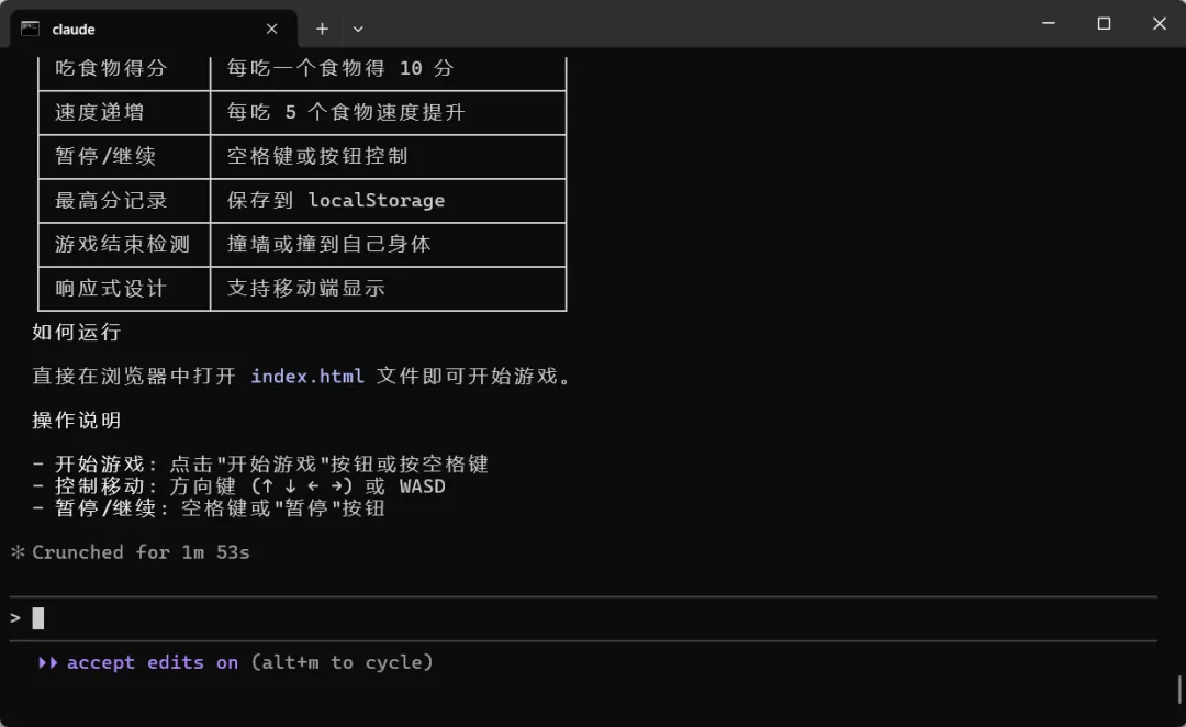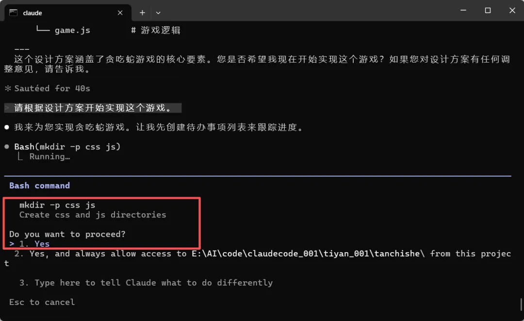 Claude Code 安装成功了,其它的先不用管,我们先来让它帮我们生成一个简单的贪吃蛇小游戏吧。