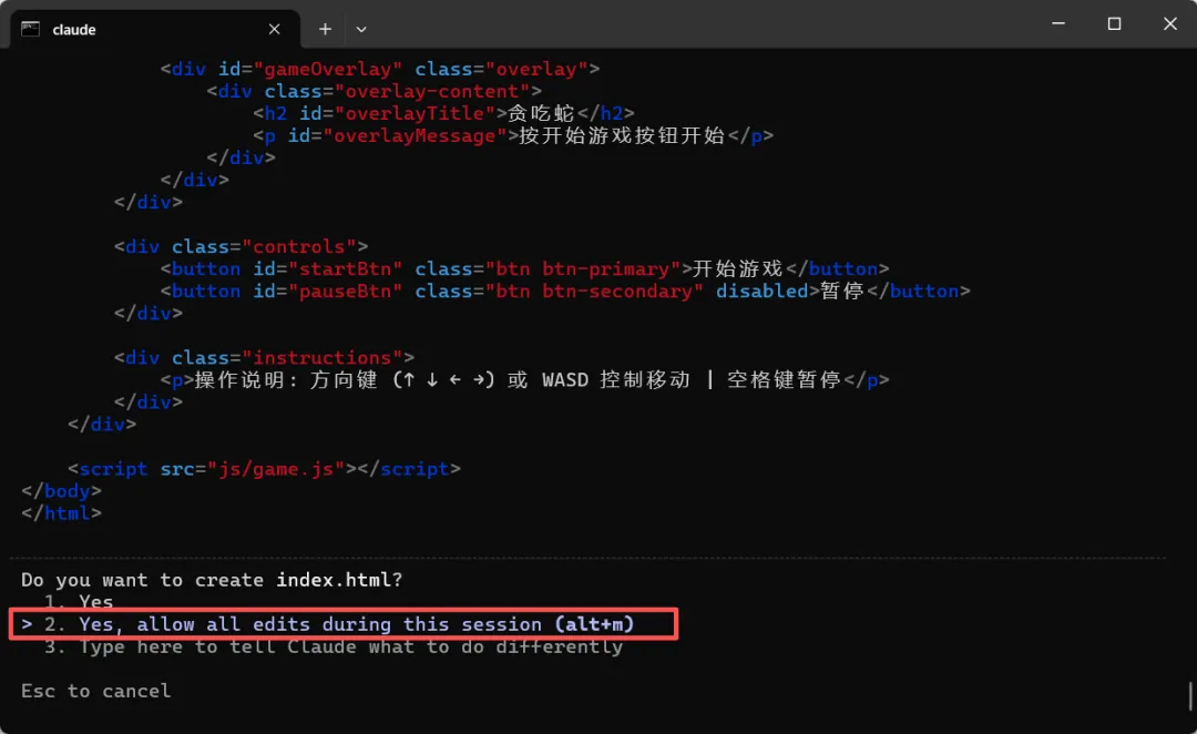 我们发现每次编辑都会询问是否继续,这样人为参与太多了,太烦人了,我们想让它自动起来,就得给它权限,所以我们选择第2个选项,允许当前会话下的所有编辑操作。