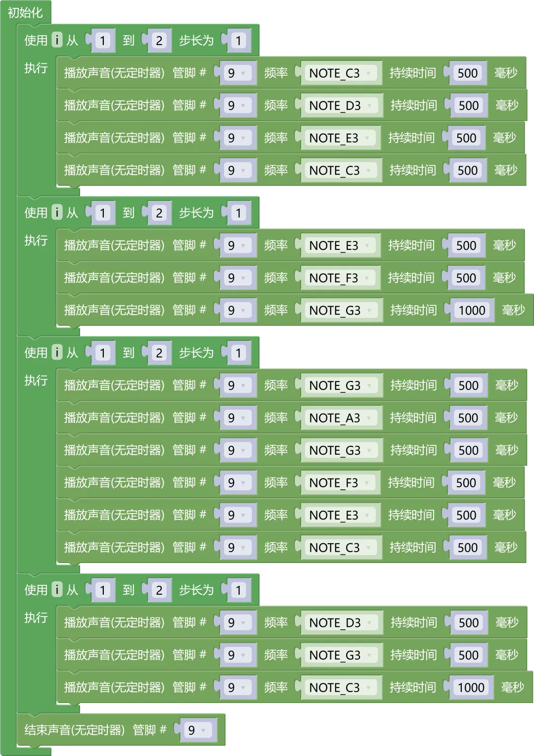 这节课我们将继续使用无源蜂鸣器制作一个《两只老虎》音乐项目。通过Mixly编程实现蜂鸣器播放《两只老虎》的音乐歌曲。 要实现蜂鸣器播放《两只老虎》歌曲,首先需要了解《两只老虎》歌曲的曲谱组成。 从《两只老虎》乐谱可以看出,曲谱每一段音符均重复了2次,因此可以使用有限循环指令来实现循环。根据曲谱了解音符“1 2 3 4 5 6 7”对应的程序中的音名“C D E F G A B”。1 2 3 4 5 6 7C D E F G A B