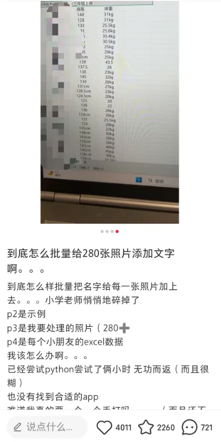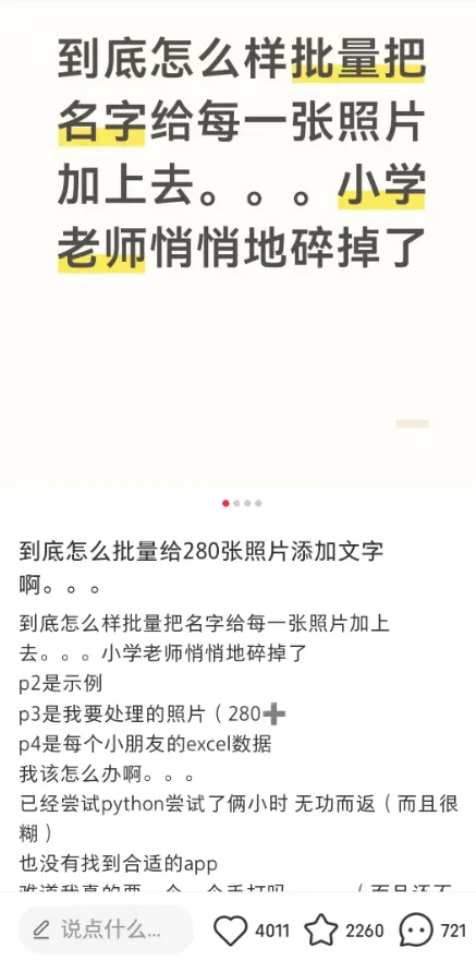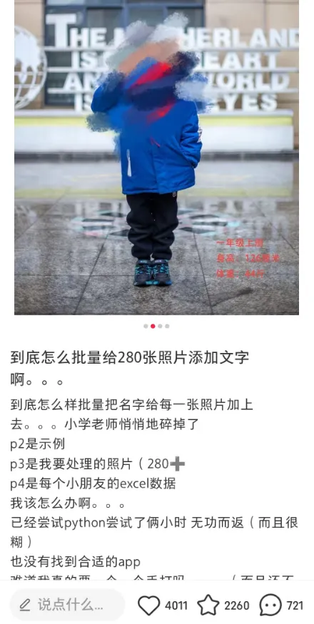 在刷小红书的时候,刷到一个老师发帖:说要给学生照片的右下角批量添加水印,一张张手动添加不仅速度慢,还无法保证对齐。