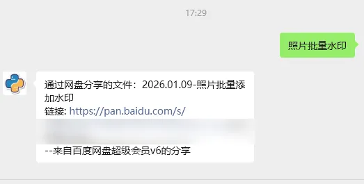 关注公众号“易派森”,在对话框输入“照片批量水印”获取完整代码。
