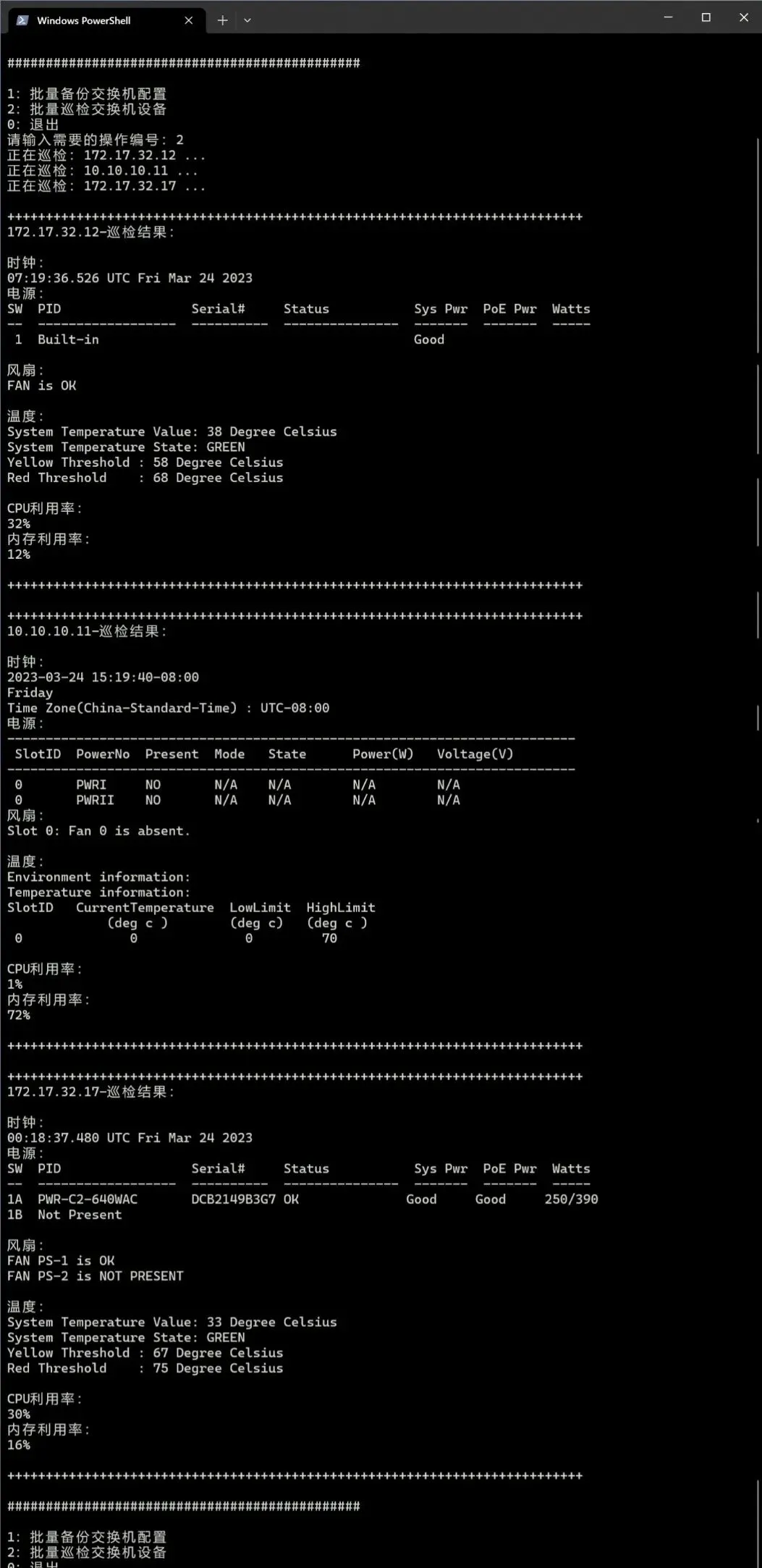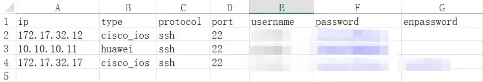 # coding=utf-8from netmiko import ConnectHandlerfrom openpyxl import load_workbookimport osfrom sys import exitfrom netmiko import exceptionsimport re# 读取excel内设备列表信息def check_and_get_dev_list(filename, sheet_name): excel_information = [] sheet_header = [] wb = load_workbook(filename) sh = wb[sheet_name] # 获取最大行数 row = sh.max_row # 获取最大列数 column = sh.max_column data = [] # 获取表头写入列表中方便调用 for data_1 in range(1, column+1): get_sheet_header = sh.cell(row=1, column=data_1).value sheet_header.append(get_sheet_header) # 第一行为表头, 此处 row +1 是pyton循环时不读取最后一个数 for row_1 in range(2, row + 1): # 存储一行信息 sheet_data_1 = dict() # 逐行读取表中的数据 for b in range(1, column + 1): cell = sh.cell(row=row_1, column=b).value # 将数据已字典形式写入 sheet_data_1 中 # if cell != None: sheet_data_1[sheet_header[b-1]] = cell excel_information.append(sheet_data_1) for i in excel_information: if i['ip'] != None: data.append(i) return data#获取excel数据并整合成dev字典def get_dev(): res = check_and_get_dev_list('./resource.xlsx', 'Sheet1') devices = [] for i in res: if i['protocol'] == 'telnet': i['type'] = i['type']+'_telnet' dev = {'device_type':i['type'], 'host': i['ip'], 'username': i['username'], 'password': i['password'], 'secret': i['enpassword'], 'port': i['port'],} devices.append(dev) return devices# 配置批量备份导出def devices_confbak(devices=''): # 创建备份文件夹 try: path = './conf_bak' os.makedirs(path) except FileExistsError: pass # 存储连接失败的IP failed_ips = [] # 循环登录设备获取配置 for dev in devices: try: with ConnectHandler(**dev) as conn: print('\n----------成功登录到:' + dev['host'] + '----------') conn.enable() if 'cisco_ios' in dev['device_type']: output = conn.send_command(command_string='show run') elif 'huawei' or 'hp_comware' in dev['device_type']: output = conn.send_command(command_string='dis current-configuration') else: print('error') with open('./conf_bak/'+ dev['host'] +'_conf_bak.txt', mode='w', encoding='utf8') as f: print('正在备份:'+dev['host']) # 文件读写异常处理 try: f.write(output) except PermissionError: print('*****-无写入权限,请将文件夹赋予读写权限-*****') continue else: print('备份成功!') # 连接异常处理 except exceptions.NetmikoAuthenticationException: print('\n**********'+dev['host']+':登录验证失败!**********') failed_ips.append(dev['host']) continue except exceptions.NetmikoTimeoutException: print('\n**********'+dev['host']+':目标不可达!**********') failed_ips.append(dev['host']) continue except exceptions.ReadTimeout: print('\n**********'+dev['host']+':读取超时,请检查enable密码是否正确!**********') failed_ips.append(dev['host']) continue if len(failed_ips) > 0: print('\n以下设备连接失败,请检查:') for x in failed_ips: print(x) return 1# 配置巡检def devices_autocheck(devices='', cmd=''): # 存储命令执行回显 results = [] try: for x in range(len(devices)): # 循环登录设备 with ConnectHandler(**devices[x]) as conn: conn.enable() print('正在巡检:'+devices[x]['host']+' ...') result = [devices[x]['host'],devices[x]['device_type']] for i in range(len(cmd)): # 循环执行命令,根据不同设备执行不同命令 if 'cisco_ios' in devices[x]['device_type']: output = conn.send_command(command_string=str(cmd[i]['cisco'])) elif 'huawei' or 'hp_comware' in devices[x]['device_type']: conn.send_command(command_string='sys',expect_string=']') output = conn.send_command(command_string=str(cmd[i]['huawei'])) result.append(output) results.append(result) except exceptions.NetmikoAuthenticationException: print('\n**********'+devices[x]['host']+':登录验证失败!**********') except exceptions.NetmikoTimeoutException: print('\n**********' + devices[x]['host'] + ':目标不可达!**********') except exceptions.ReadTimeout: print('\n**********' + devices[x]['host'] + ':读取超时,请检查enable密码是否正确!**********') return results# 计算内存使用率def get_mem(memstr,devtype=''): if 'cisco' in devtype: total_match = re.search(r'Processor Pool Total:\s+(\d+)', memstr) used_match = re.search(r'Used:\s+(\d+)', memstr) # 提取总数和已用数,并将其转换为整数 total = int(total_match.group(1)) used = int(used_match.group(1)) # 计算使用百分比 percentage = used / total * 100 return f"{percentage:.0f}%" elif 'huawei' in devtype: match = re.search(r"Memory Using Percentage Is:\s*(\d+)%", memstr) if match: memory_percentage = match.group(1) return memory_percentage+'%' else: return "No match found."# 获取CPU利用率def get_cpu(cpustr,devtype=''): if 'cisco' in devtype: pattern = r"CPU utilization for five seconds: (\d+)%" match = re.search(pattern, cpustr) if match: cpu_utilization = match.group(1) return cpu_utilization+'%' else: return "No match found." elif 'huawei' in devtype: match = re.search(r"\b(\d+(\.\d+)?)%.*?\bMax", cpustr) if match: cpu_utilization = match.group(1) return cpu_utilization+'%' else: return "No match found."# 运行主程序if __name__ == '__main__': while True: print("\n##############################################\n") print("1:批量备份交换机配置") print("2:批量巡检交换机设备") print("0:退出") option = str(input("请输入需要的操作编号:")) if option == '1': dev = get_dev() devices_confbak(devices=dev) continue elif option == '2': # 定义巡检命令 # cmds[x]['cisco'] # cmds[x]['huawei'] cmds = [ {'cisco':'show clock','huawei':'display clock'}, #检查时钟 {'cisco':'show env power','huawei':'display power'}, #检查电源 {'cisco':'show env fan','huawei':'display fan'}, #检查风扇 {'cisco':'show env temperature status', 'huawei': 'display environment'},#检查温度 {'cisco':'show processes cpu', 'huawei': 'display cpu-usage'}, #检查CPU利用率 {'cisco':'show processes memory', 'huawei': 'display memory-usage'}, #检查内存