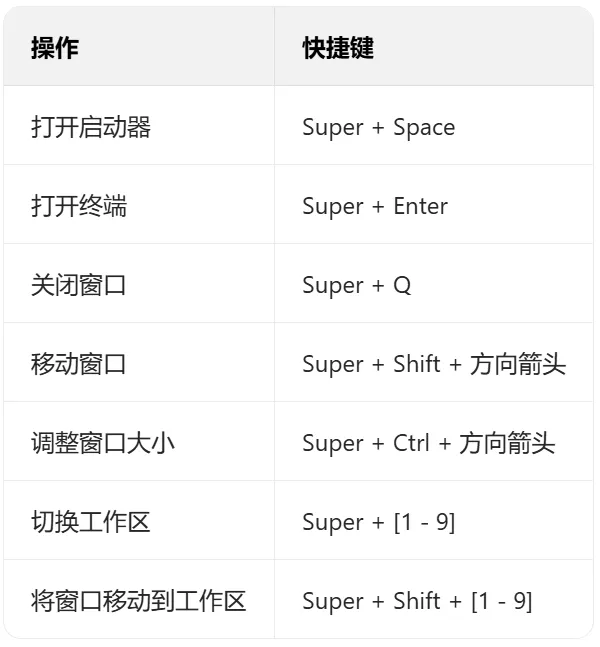 Super + Enter: 启动你的终端(通常是Alacritty)。Super + Space: 打开应用程序启动器。Super + Q: 关闭聚焦窗口。Super + H/J/K/L: 在窗口间移动焦点(Vim风格导航)。Super + Shift + [Number]: 将窗口移动到另一个工作区。