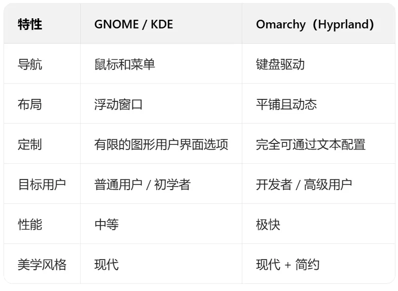 GNOME或KDE可能适合从Windows转过来的用户,而Omarchy对那些习惯使用生产力快捷方式和终端命令的用户更有吸引力。