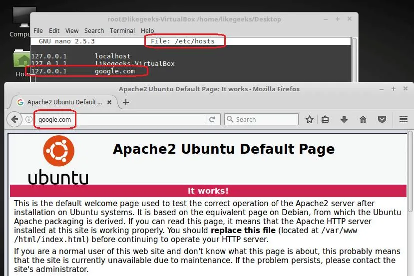 然后,返回你的浏览器,输入google.com,看看结果如何。如果你的系统上安装了Apache并且本地主机正在运行,浏览器会显示localhost的索引页,而不是Google页面。
