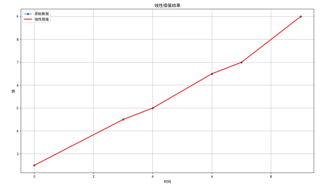 我们也可以通过绘图,更直观的来观察,都是一些离散的点和线段组成:df['Linear_Interpolation'] = df['Value'].interpolate(method='linear') # 线性插值plt.figure(figsize=(10,5))plt.plot(df['Time'], df['Value'], marker='o', label='原始数据',markersize=5) # 原始数据plt.plot(df['Time'], df['Linear_Interpolation'], 'r-', label='线性插值',linewidth=2) # 线性插值plt.xlabel('时间')plt.ylabel('值')plt.title('线性插值结果')plt.legend()plt.grid()plt.show()