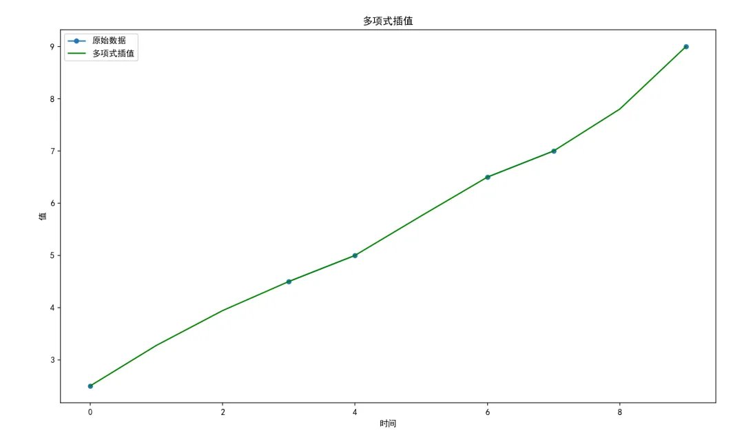 可以看到线性插值之后的绘图,填补了缺失的数值。使用了pandas库中的interpolate方法对缺失值进行线性插补。这种方法通过计算相邻已知值之间的线性关系来估算缺失值。多项式插值通过拟合高阶多项式来估计缺失值,可以通过拉格朗日插值法或者牛顿插值法等方法构建,valid_data = df.dropna(subset=['Value']) # 删除缺失值poly_interpolator = interp1d(valid_data['Time'], valid_data['Value'], kind='quadratic', fill_value='extrapolate')df['Poly_Interpolation'] = poly_interpolator(df['Time']) # 二次插值plt.plot(df['Time'], df['Poly_Interpolation'], 'g-', label='多项式插值',markersize=5)plt.legend()plt.xlabel('时间')plt.ylabel('值')plt.title('多项式插值')plt.show()