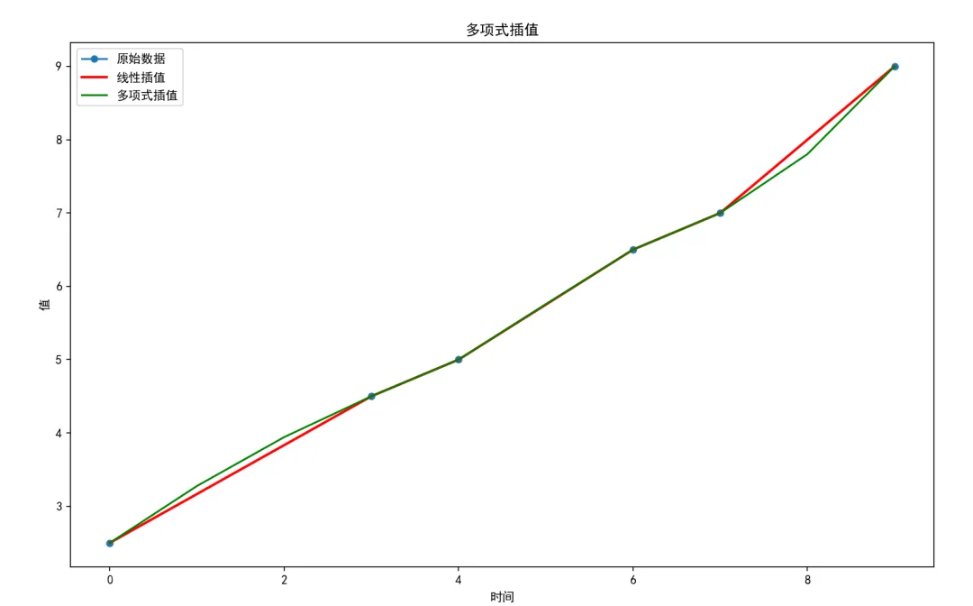 这个也属于数据预处理的重要步骤,于是我们就对已知的数据点创建了一个二次函数。其中参数kind='quadratic':表示使用二次多项式进行插值参数fill_value='extrapolate':允许在数据范围外进行外推预测当然我们也可以打印出线性插值和多项式插值的数据,以及将它们都生成在一张图上,可以对比两者插值产生的效果: Time Value Linear_Interpolation Poly_Interpolation0 0 2.5 2.500000 2.5000001 1 NaN 3.166667 3.2761392 2 NaN 3.833333 3.9428053 3 4.5 4.500000 4.5000004 4 5.0 5.000000 5.0000005 5 NaN 5.750000 5.7564686 6 6.5 6.500000 6.5000007 7 7.0 7.000000 7.0000008 8 NaN 8.000000 7.8029729 9 9.0 9.000000 9.000000