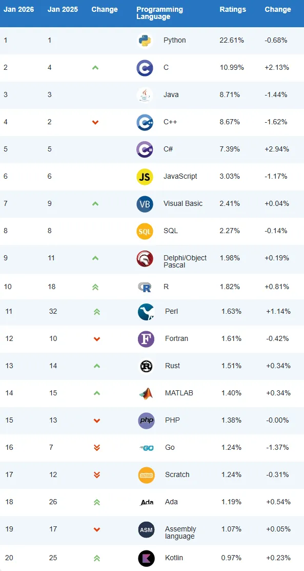 TIOBE 1月Top20编程语言:
