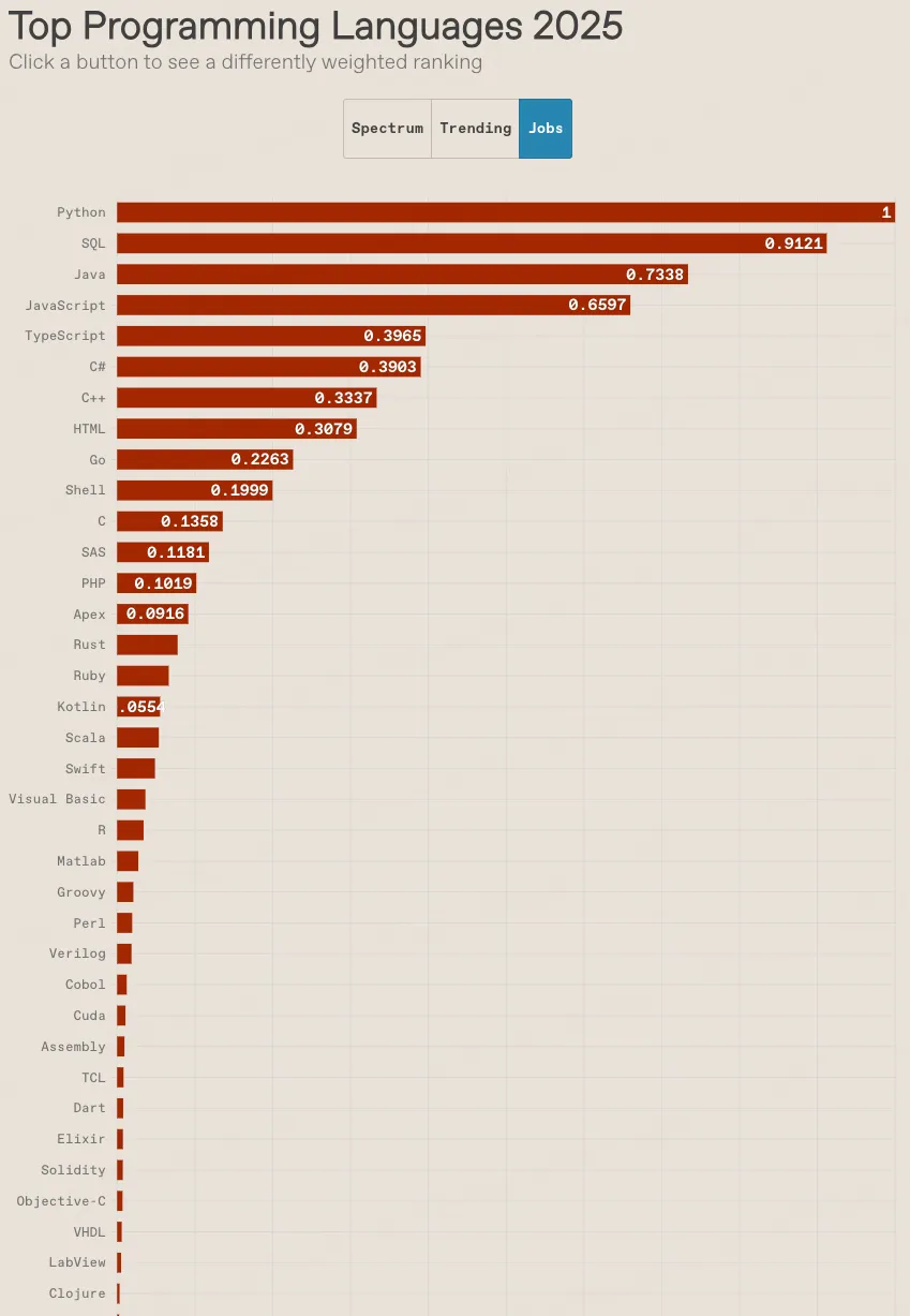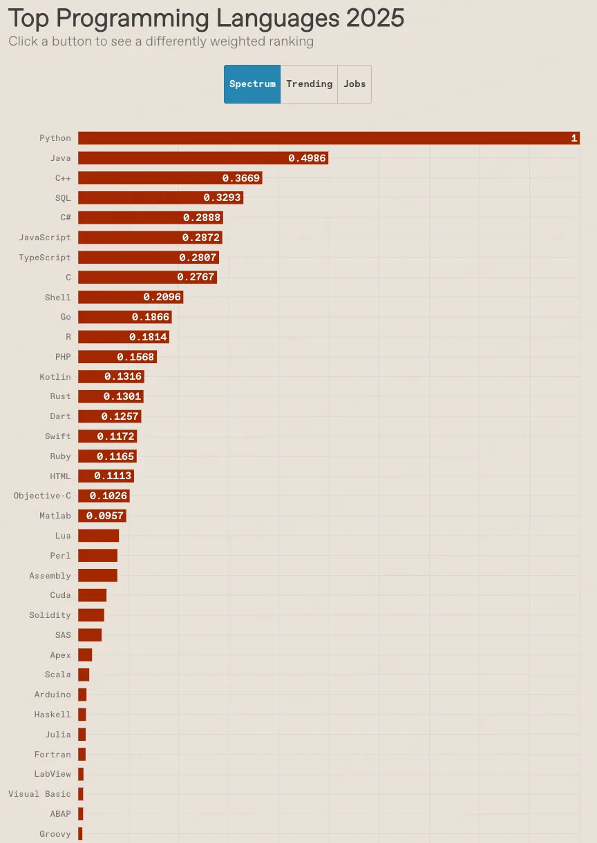 在另一份极有分量的IEEE Spectrum顶级编程语言榜中,Python展现了什么叫“全方位无死角”的强大:它在综合榜、趋势榜、就业榜这三大最关键的维度上,全部位列第一,强势拿下“三冠王”!
