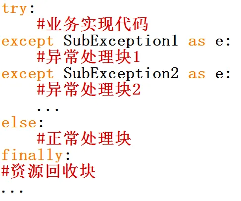 - except块和finally块都是可选的,但except块和finally块至少出现其中之一,也可以同时出现;多个except块必须位于try块之后;