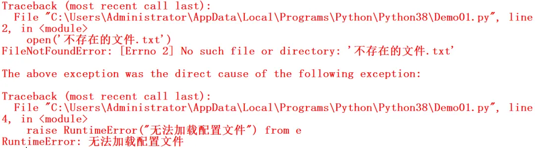 Python 用 raise ... from ... 语法显式建立这种链。try: open('不存在的文件.txt')except FileNotFoundError as e: raise RuntimeError("无法加载配置文件") from e