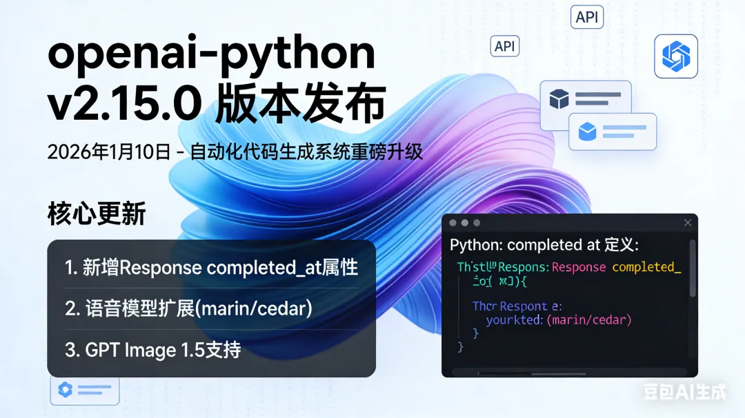 2026年1月10日,openai-python迎来了最新版本 v2.15.0。该版本由自动化代码生成系统发布,包含重要的功能更新与内部优化,是一次面向开发者的实用增强升级。以下为详细更新内容及代码层面变化解析。