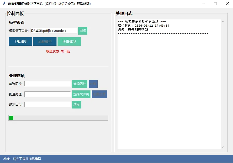 import tkinter as tkfrom tkinter import ttk, filedialog, messagebox, scrolledtextimport threadingimport queuefrom datetime import datetimeimport osclass CardCorrectionGUI: def __init__(self, root): self.root = root self.root.title("📷智能票证检测矫正系统(欢迎关注微信公众号:码海听潮)") self.root.geometry("900x600") self.root.resizable(False, False) # 设置主题颜色 self.bg_color = "#f0f0f0" self.primary_color = "#4a6fa5" self.secondary_color = "#166088" self.accent_color = "#59c9a5" # 创建处理器实例 self.processor = None self.model_loaded = False # 创建界面 self.setup_ui() # 消息队列用于线程通信 self.message_queue = queue.Queue() # 启动消息处理器 self.root.after(100, self.process_messages) def setup_ui(self): # 设置窗口样式 self.root.configure(bg=self.bg_color) # 创建主容器 main_container = tk.Frame(self.root, bg=self.bg_color) main_container.pack(fill="both", expand=True, padx=20, pady=10) # 左侧控制面板 control_frame = tk.LabelFrame( main_container, text="控制面板", font=("微软雅黑", 12, "bold"), bg=self.bg_color, relief="groove", bd=2 ) control_frame.pack(side="left", fill="y", padx=(0, 10)) # 模型设置 model_frame = tk.Frame(control_frame, bg=self.bg_color) model_frame.pack(fill="x", pady=10, padx=10) tk.Label( model_frame, text="模型设置", font=("微软雅黑", 11, "bold"), bg=self.bg_color ).pack(anchor="w") # 缓存目录选择 cache_frame = tk.Frame(model_frame, bg=self.bg_color) cache_frame.pack(fill="x", pady=5) tk.Label( cache_frame, text="模型缓存目录:", bg=self.bg_color ).pack(side="left") # 默认缓存目录 default_cache = os.path.join(os.path.dirname(os.path.abspath(__file__)), 'models') self.cache_var = tk.StringVar(value=default_cache) cache_entry = tk.Entry( cache_frame, textvariable=self.cache_var, width=25 ) cache_entry.pack(side="left", padx=5) tk.Button( cache_frame, text="浏览", command=self.browse_cache_dir, bg=self.accent_color, fg="white", relief="flat" ).pack(side="left") # 模型操作按钮框架 model_buttons_frame = tk.Frame(model_frame, bg=self.bg_color) model_buttons_frame.pack(fill="x", pady=5) # 下载模型按钮 self.download_model_btn = tk.Button( model_buttons_frame, text="下载模型", command=self.download_model, bg=self.secondary_color, fg="white", font=("微软雅黑", 10), relief="flat", width=10 ) self.download_model_btn.pack(side="left", padx=2) # 加载模型按钮 self.load_model_btn = tk.Button( model_buttons_frame, text="加载模型", command=self.load_model, bg=self.secondary_color, fg="white", font=("微软雅黑", 10), relief="flat", width=10, state="disabled" # 初始禁用,下载完成后启用 ) self.load_model_btn.pack(side="left", padx=2) # 检查模型按钮 self.check_model_btn = tk.Button( model_buttons_frame, text="检查模型", command=self.check_model, bg=self.accent_color, fg="white", font=("微软雅黑", 10), relief="flat", width=10 ) self.check_model_btn.pack(side="left", padx=2) self.model_status_label = tk.Label( model_frame, text="模型状态: 未下载", fg="red", bg=self.bg_color ) self.model_status_label.pack(pady=5) # 模型文件信息标签 self.model_info_label = tk.Label( model_frame, text="", fg="gray", bg=self.bg_color, font=("微软雅黑", 9) ) self.model_info_label.pack() # 分隔线 ttk.Separator(control_frame, orient="horizontal").pack(fill="x", pady=10, padx=10) # 处理选项 process_frame = tk.Frame(control_frame, bg=self.bg_color) process_frame.pack(fill="x", pady=10, padx=10) tk.Label( process_frame, text="处理选项", font=("微软雅黑", 11, "bold"), bg=self.bg_color ).pack(anchor="w") # 单张图片处理 single_frame = tk.Frame(process_frame, bg=self.bg_color) single_frame.pack(fill="x", pady=5) tk.Label( single_frame, text="单张图片:", bg=self.bg_color ).pack(side="left") self.single_input_var = tk.StringVar() tk.Entry( single_frame, textvariable=self.single_input_var, width=25 ).pack(side="left", padx=5) tk.Button( single_frame, text="选择图片", command=self.select_single_image, bg=self.accent_color, fg="white", relief="flat" ).pack(side="left") self.single_process_btn = tk.Button( single_frame, text="处理", command=self.process_single, bg=self.primary_color, fg="white", relief="flat", state="disabled" # 初始禁用 ) self.single_process_btn.pack(side="left", padx=5) # 批量处理 batch_frame = tk.Frame(process_frame, bg=self.bg_color) batch_frame.pack(fill="x", pady=5) tk.Label( batch_frame, text="批量处理:", bg=self.bg_color ).pack(side="left") self.batch_input_var = tk.StringVar() tk.Entry( batch_frame, textvariable=self.batch_input_var, width=25 ).pack(side="left", padx=5) tk.Button( batch_frame, text="选择文件夹", command=self.select_batch_folder, bg=self.accent_color, fg="white", relief="flat" ).pack(side="left") self.batch_process_btn = tk.Button( batch_frame, text="批量处理", command=self.process_batch, bg=self.primary_color, fg="white", relief="flat", state="disabled" # 初始禁用 ) self.batch_process_btn.pack(side="left", padx=5) # 输出目录 output_frame = tk.Frame(process_frame, bg=self.bg_color) output_frame.pack(fill="x", pady=5) tk.Label( output_frame, text="输出目录:", bg=self.bg_color ).pack(side="left") self.output_var = tk.StringVar() tk.Entry( output_frame, textvariable=self.output_var, width=25 ).pack(side="left", padx=5) tk.Button( output_frame, text="选择", command=self.select_output_folder, bg=self.accent_color, fg="white", relief="flat" ).pack(side="left") # 进度条 self.progress = ttk.Progressbar( control_frame, mode='indeterminate' ) self.progress.pack(fill="x", pady=10, padx=10) # 右侧日志显示区域 log_frame = tk.LabelFrame( main_container, text="处理日志", font=("微软雅黑", 12, "bold"), bg=self.bg_color, relief="groove", bd=2 ) log_frame.pack(side="right", fill="both", expand=True) self.log_text = scrolledtext.ScrolledText( log_frame, wrap=tk.WORD, width=60, height=30, font=("Consolas", 10) ) self.log_text.pac