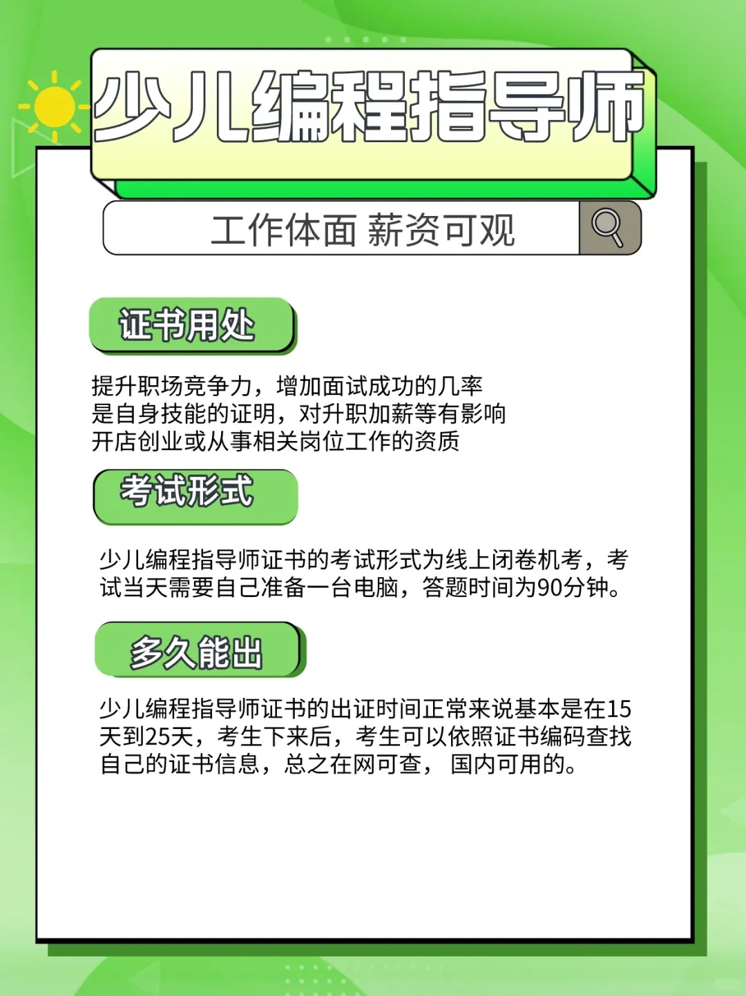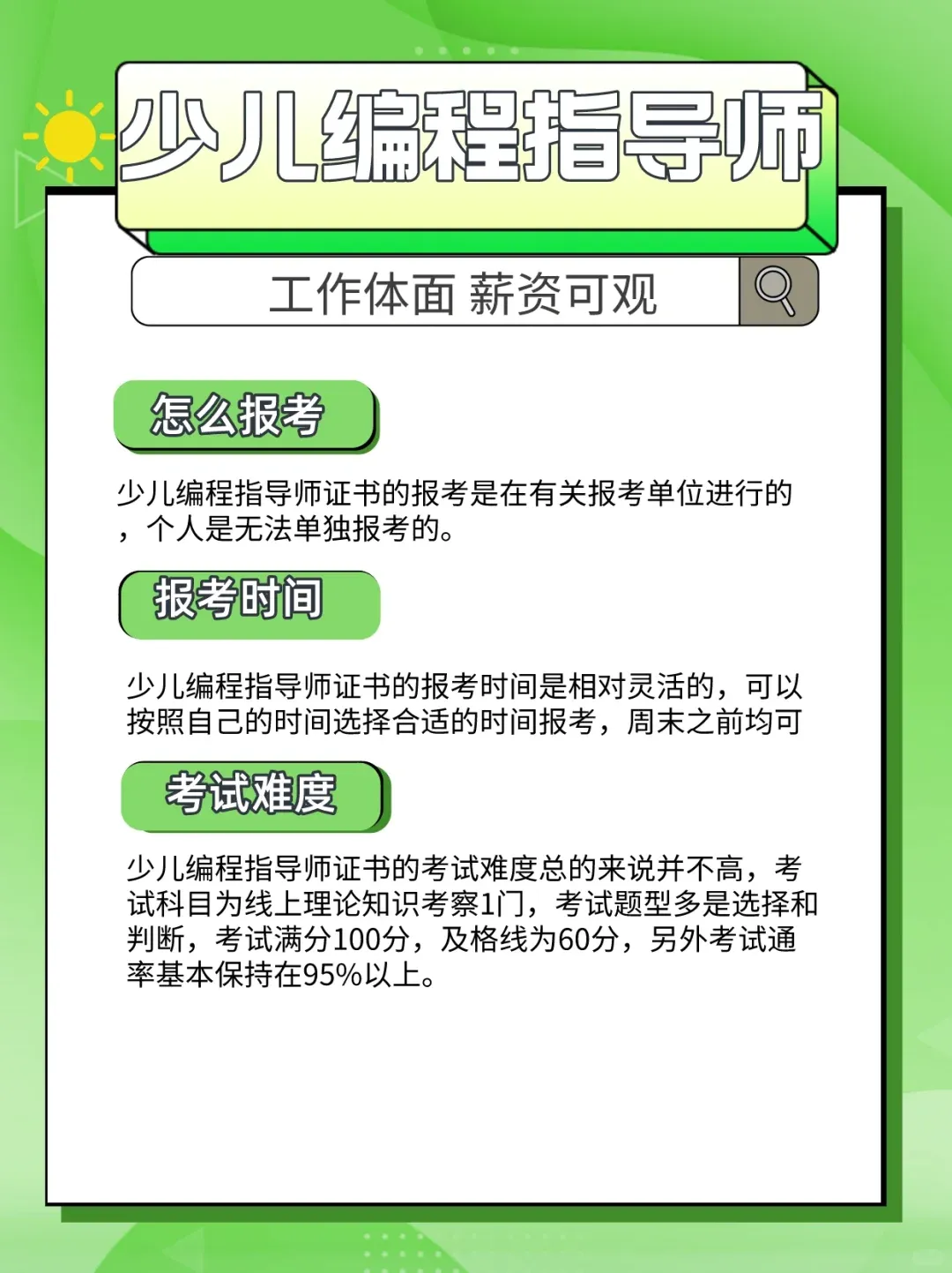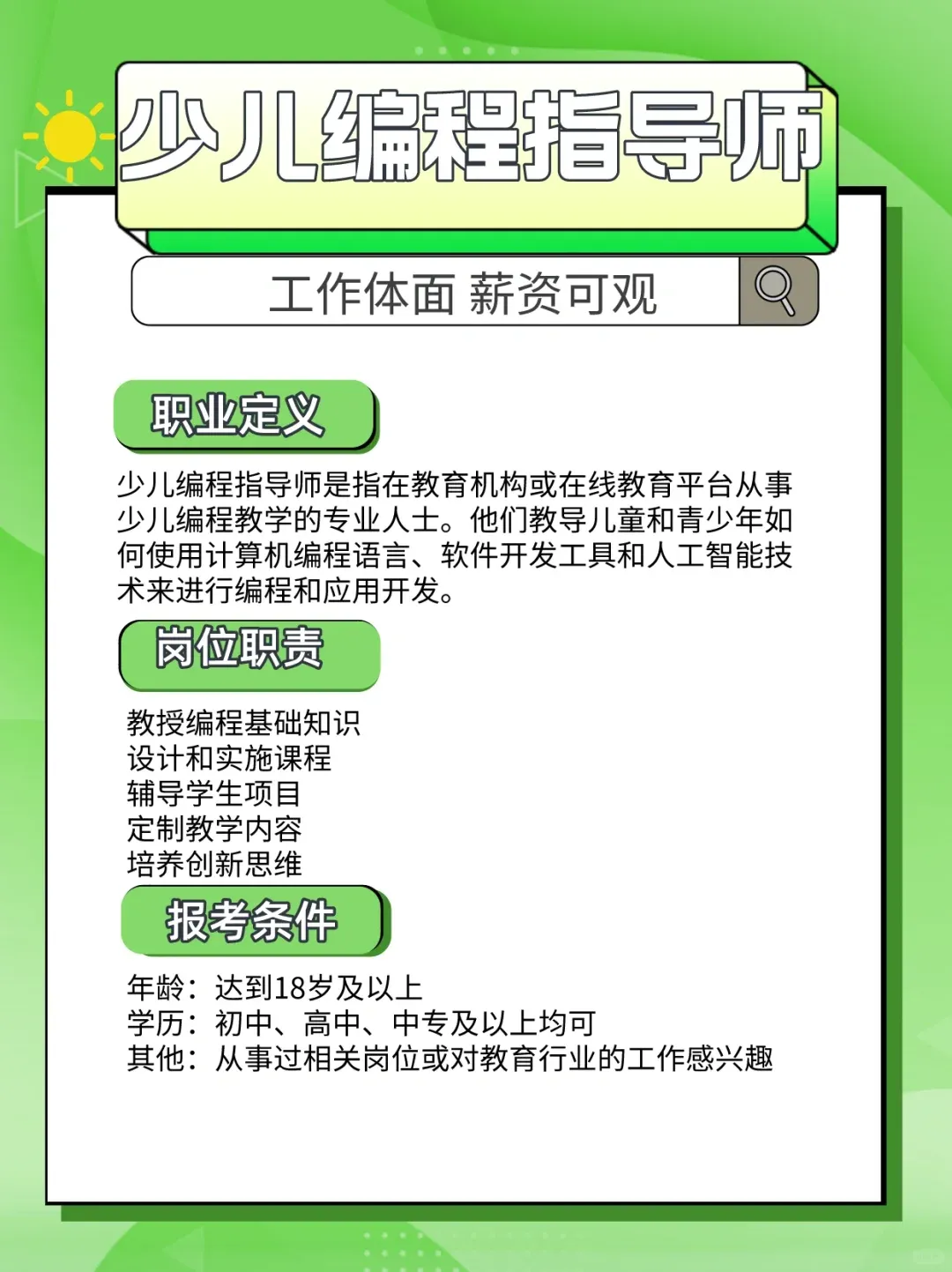 姐妹们看过来!今天不聊别的,全是关于少儿编程指导师证的硬核干货!如果你对这个岗位感兴趣,千万别划走,花两分钟看完,带你理清报考全流程~