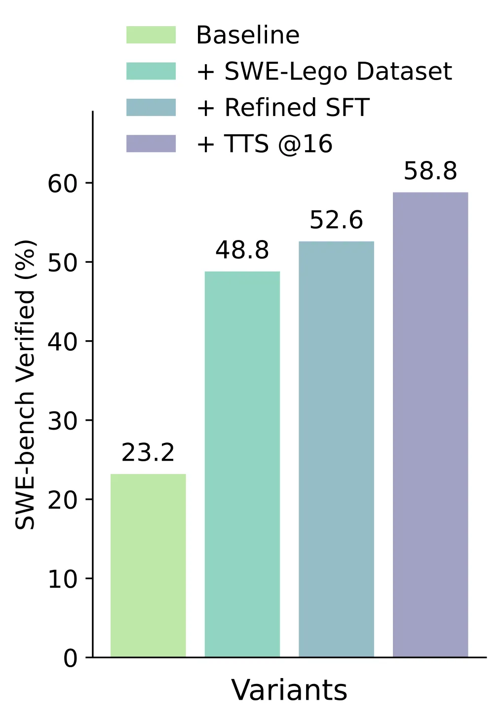 图 2:SWE-Lego-Qwen3-32B 的性能提升分解,混合数据集贡献最大(+25.6%),改进的 SFT 贡献 + 3.8%,TTS 贡献 + 6.2%