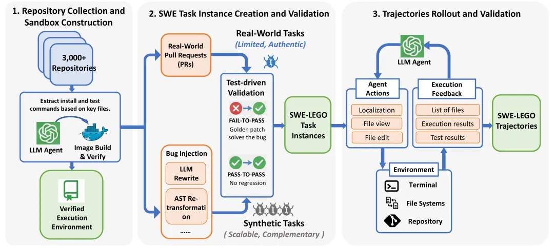 为了确保训练数据的质量,SWE-Lego 实施了严格的轨迹生成和验证流程。