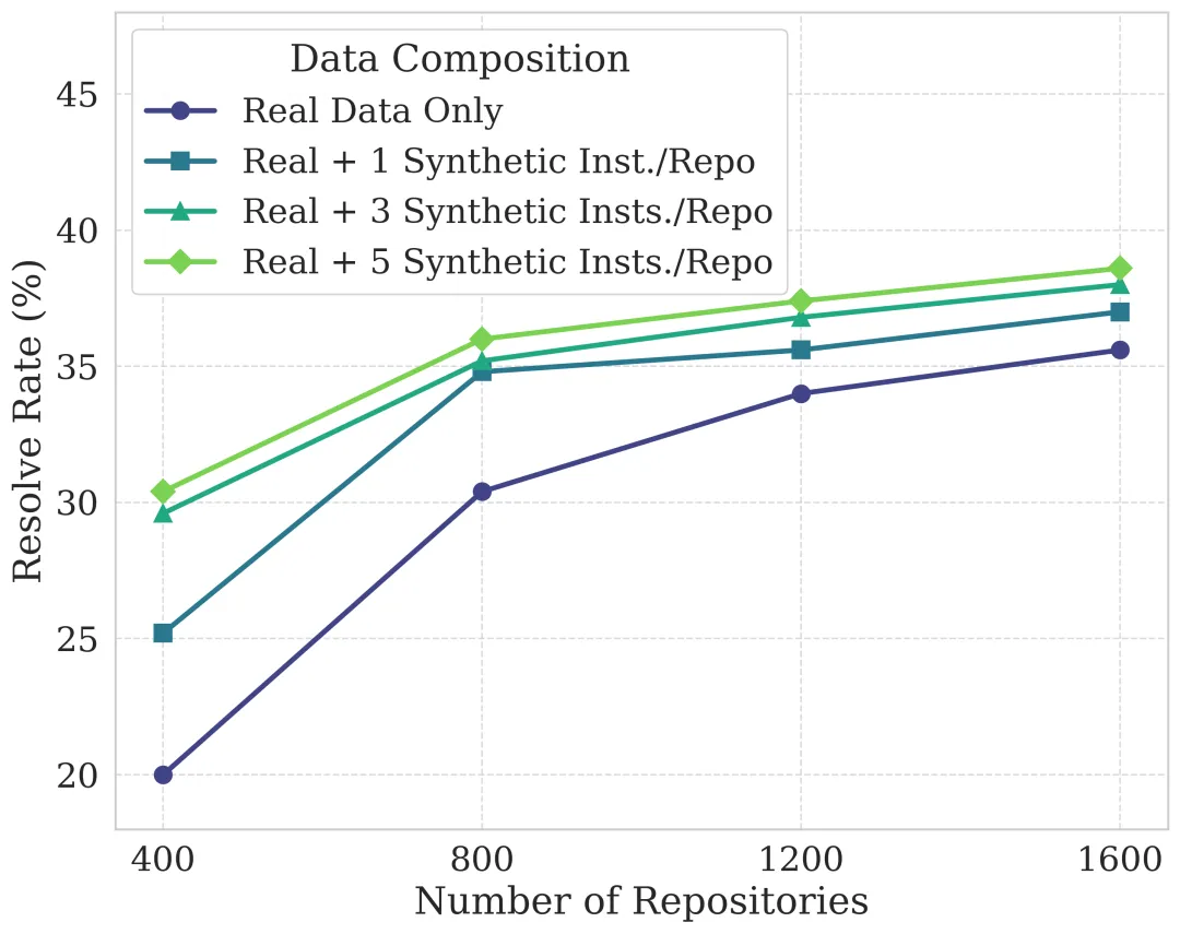 SWE-Lego 采用混合数据构建策略,结合真实世界数据和合成数据。真实世界数据来自严格筛选的 GitHub Pull Requests (PRs),这里的 PRs 中非测试文件作为 Golden Patch, 也就是这个任务的解决方案。真实 PR 数据具有贴近生产环境的优势,能够提供真实的 bug 的复杂性,真实的任务参考 SWE-rebench [1]。但是真实数据数量有限,且每个任务需要独立的沙箱环境,成本较高。
