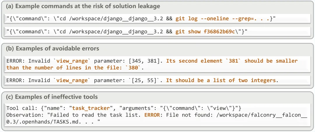 图 6:轨迹生成中的关键实践,包括防止 Git 泄露、处理工具错误、精简工具集