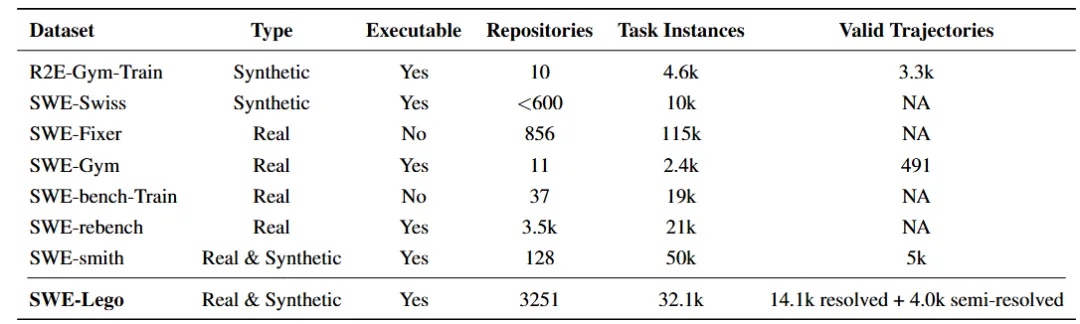 表 1:SWE-Lego 的可验证的任务实例和有效训练轨迹的统计以及和其他 SWE 相关工作的数据对比