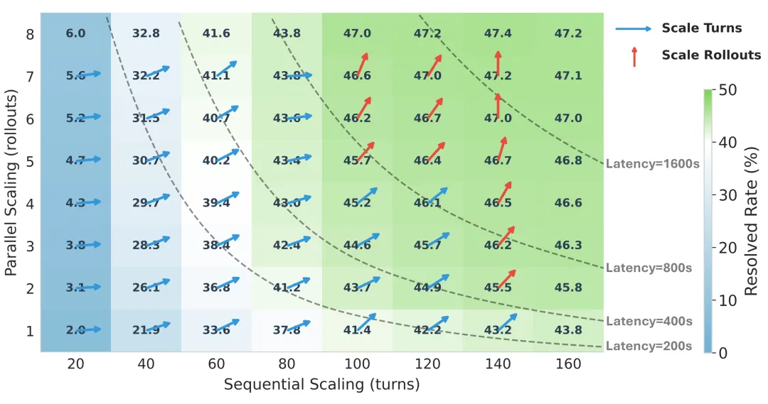 SWE-Lego 研究了串行扩展和并行扩展之间的资源分配。串行扩展通过增加最大交互轮次实现,在低测试预算的区域非常高效。额外轮次都能获得环境反馈,使模型能够纠正错误并迭代改进解决方案。这使得串行扩展在预算有限时成为首选策略。然而,模型性能在约 100-140 轮后开始饱和,此时相比于串行扩展,更加需要并行扩展来提升性能。