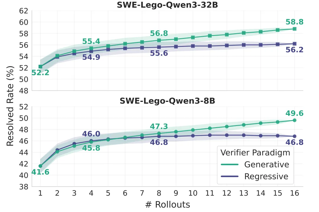打分器用于从多个候选轨迹中选择最佳方案。SWE-Lego 比较了两种范式:回归式打分器和生成式打分器。