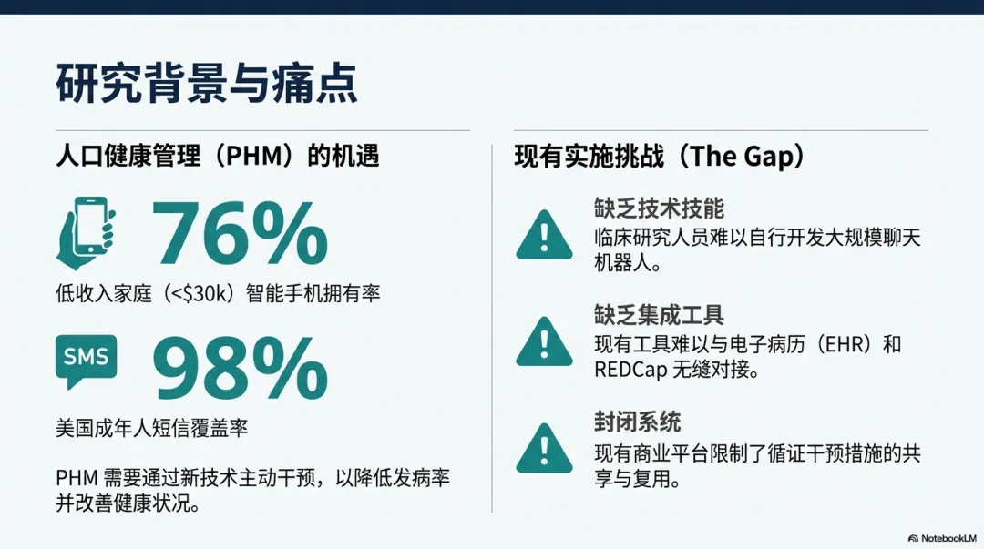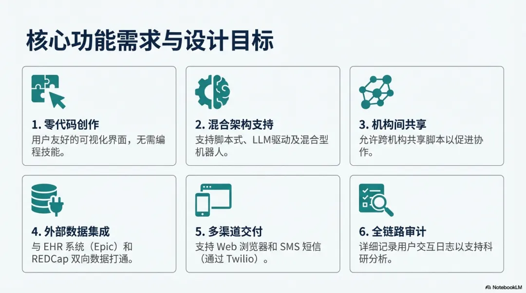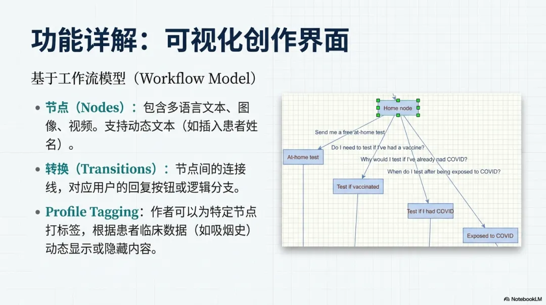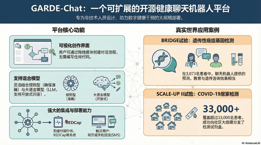 期刊:Journal of the American Medical Informatics Association (JAMIA)标题:GARDE-Chat: a scalable, open-source platform for building and deploying health chatbots作者:Guilherme Del Fiol, MD, PhD 等机构:犹他大学生物医学信息系 (Department of Biomedical Informatics, University of Utah)在数字健康与群体健康管理(Population Health Management, PHM)的研究前沿,即使是最顶尖的临床团队也常面临一道难以逾越的技术鸿沟:我们拥有经过严谨论证的干预思路,却缺乏将这些思路转化为可扩展、自动化工具的技术手段。今天向大家推荐发表在医疗信息学顶刊JAMIA上的一项重磅成果——GARDE-Chat。这不仅仅是一个软件,它是犹他大学团队为全球医学研究者提供的一套开源基础设施。它正试图通过“零代码”的方式,将构建医疗级AI聊天机器人的能力,从工程师手中交还给最懂病人的临床专家。长期以来,临床研究中的数字化干预往往受制于高昂的开发成本和复杂的编程壁垒。GARDE-Chat 的核心创新在于彻底打破了这一局面。它提供了一个可视化的拖拽式创作界面,让没有一行代码经验的教授或博士生,也能像设计临床路径流程图一样,轻松构建出复杂的健康聊天机器人。这种赋能是战略性的。研究者不再是被动的需求提出者,而是成为了数字干预工具的直接创造者。平台支持多媒体(文本、图片、视频)和多语言内容的无缝嵌入,这意味着无论是针对慢病管理的患者教育,还是复杂的遗传学咨询引导,都可以由医学专家亲自操刀设计,确保了内容的医学准确性与人文关怀。规则与大模型的融合