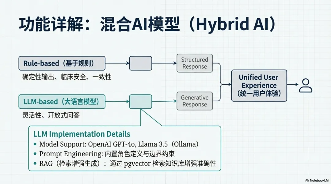 在AI大模型(LLM)风靡的今天,GARDE-Chat 展现出了极具前瞻性的技术架构。它并未盲目追求全盘AI化,而是提供了一种“混合式”(Hybrid)的解决方案。对于临床中不容出错的标准流程(如资格筛查、知情同意),平台支持基于规则(Rule-based)的脚本,确保信息的绝对准确和安全;而对于患者开放式的疑问,平台则能无缝调用集成的大语言模型(如GPT-4或Llama系列)进行自然语言交互。这种设计既保留了临床研究必须的严谨性,又赋予了工具极强的交互灵活性,有效规避了纯LLM可能产生的“幻觉”风险。打通临床数据的流通
