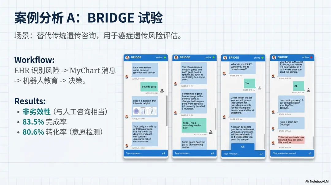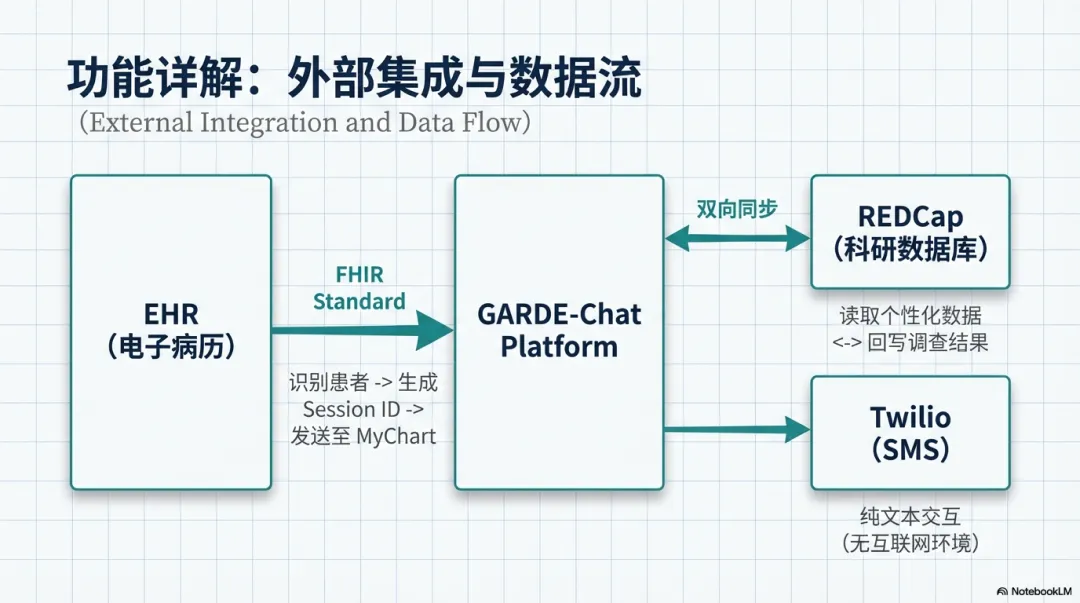 GARDE-Chat 最具含金量、也是最令研究人员兴奋的功能,在于其强大的系统集成能力。它并非一个孤立的对话框,而是能与电子健康记录(EHR)和科研数据采集神器REDCap实现双向互通。试想这样一个闭环工作流:GARDE算法在EHR后台自动识别出符合入组条件的患者,系统自动发送带有唯一标识的聊天链接;患者在手机上完成交互后,其产生的数据(如问卷结果、检测意愿)又会自动回写至EHR或REDCap数据库。这种全自动化的数据闭环,对于开展大规模的实用性临床试验(Pragmatic Clinical Trials)至关重要,它极大地降低了人力成本,使得覆盖数万人的群体干预成为可能。在大规模试验中得到验证