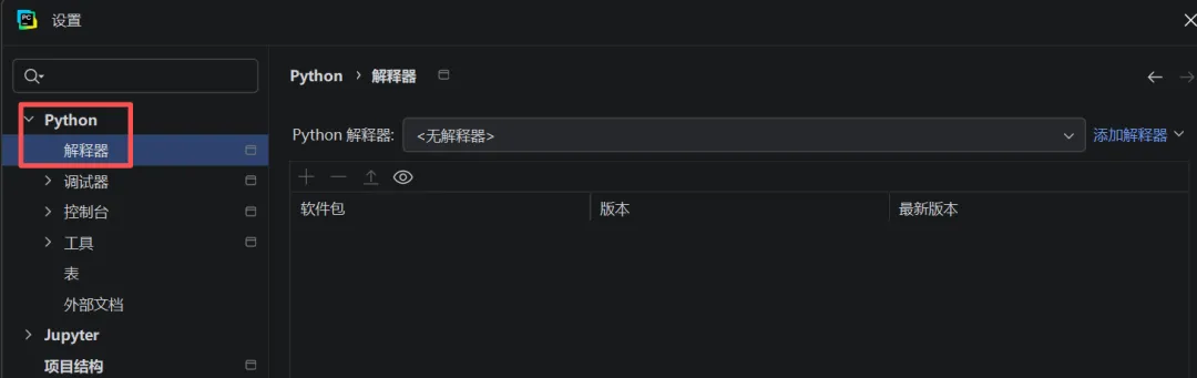 配置 Python 解释器:如果你已经安装了 Python,PyCharm 会自动检测并配置解释器。如果没有安装,你可以手动添加。